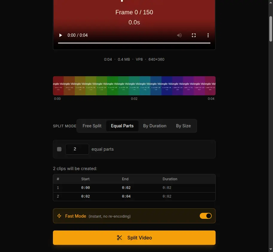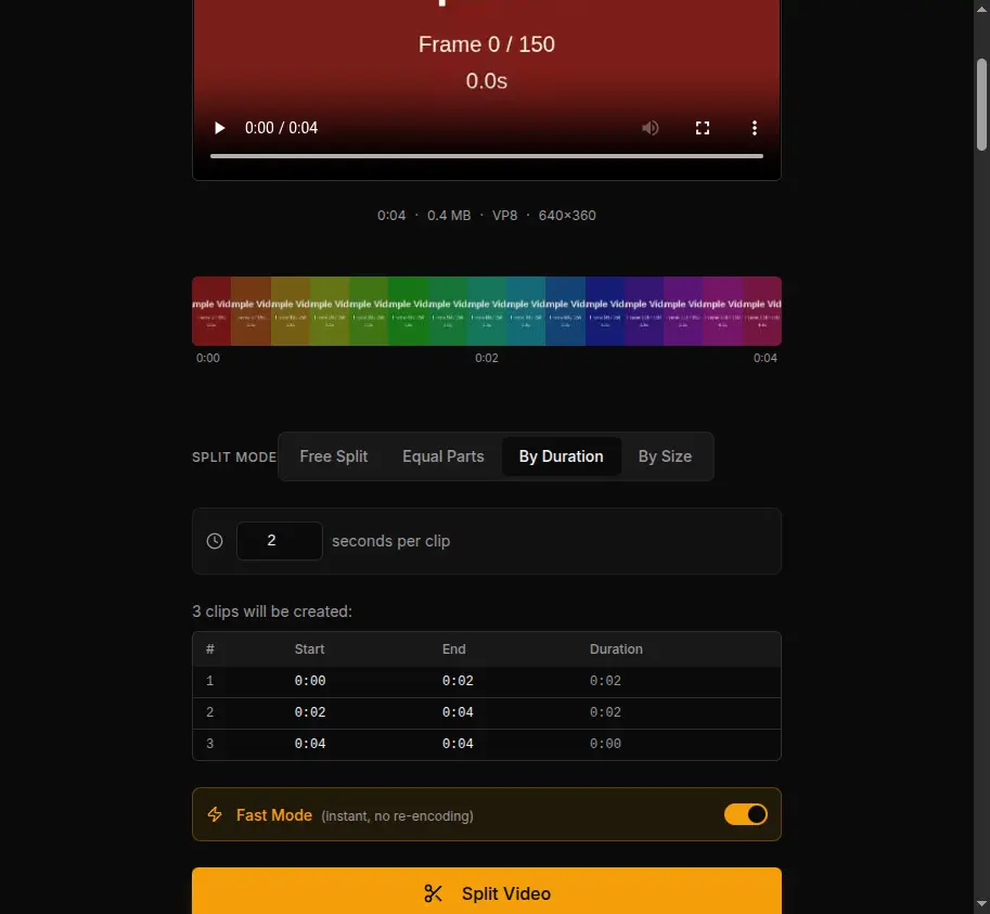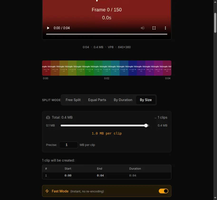 Fast Mode is on by default. It splits the video almost instantly because it copies the original video data without re-processing it. The tradeoff is that cuts land on the nearest keyframe rather than the exact frame you selected. In practice, this means cuts might be off by a second or two.