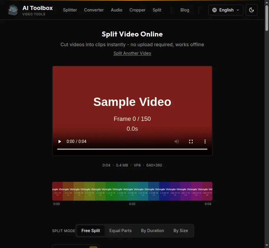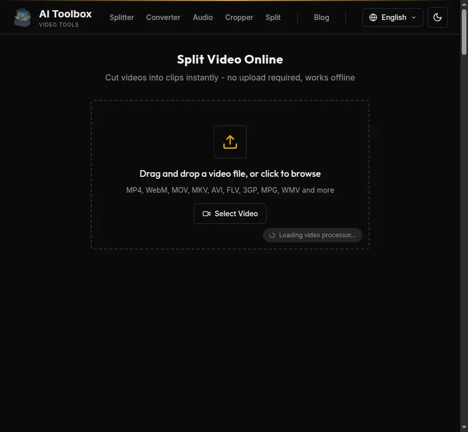 AI Toolbox's video splitter works entirely in your browser. When you drop a video file onto the tool, it does not get sent anywhere. The file stays in your browser's memory, and all the processing happens on your own device using a technology called WebAssembly.