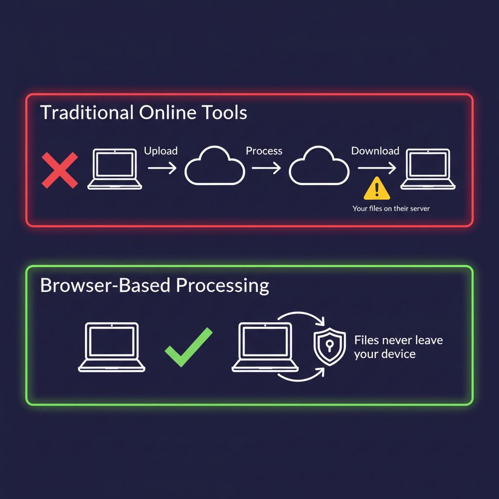 Traditional online tools need servers because browsers historically could not handle heavy processing. WebAssembly changed that. By running FFmpeg directly in the browser, there is no server in the loop. The AI Toolbox website serves the page and the WebAssembly module, but once those are loaded, your browser does all the work independently.